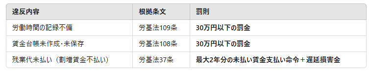 会社は、労働時間の記録を適切に管理し、賃金台帳を5年間保存する義務(労基法108条・109条) を負う。違反すると以下の罰則がある。