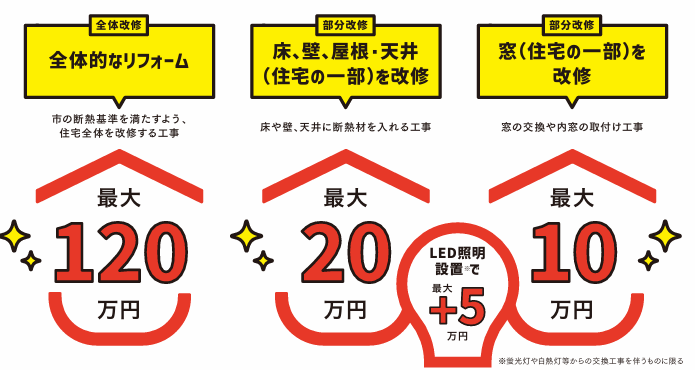 また、窓の改修(交換・内窓設置)にはサイズ別に補助額が設定されており、さらに、LED照明への交換工事も含めれば+5万円の補助も追加可能!