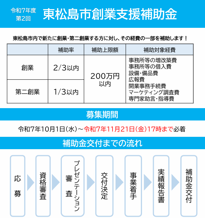 新しく事業を始める方に朗報です。東松島市では、地域の産業活性化を目的として「創業支援補助金」を交付しています。東松島市内で創業・第二創業を考えている方 にとっては大きなチャンスとなります。今回は、令和7年度第2回 東松島市創業支援補助金 の概要をご紹介します。