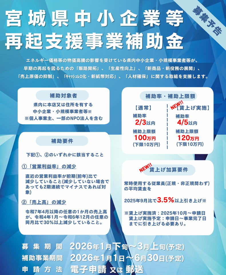 宮城県から、事業者が待っていた補助金の募集予告が出ました。令和7年度12月補正「宮城県中小企業等再起支援事業補助金」です。今回の補助金は、最大100万円(条件により120万円)と金額が大きく、販路開拓や設備投資、人材確保など幅広い取組に使える点が特徴です。物価高や仕入価格の上昇、売上減少の影響を受けている宮城県内の中小企業・個人事業主が対象で、申請受付は令和8年1月下旬から予定されています。補助対象となる事業は年明け1月1日以降の発注分からとなるため、今のうちから検討しておくことが重要です。宮城県の補助金の中でも、金額・使いやすさの両面で評価できる制度です。条件が合う事業者にとっては、見逃せない補助金といえるでしょう。
