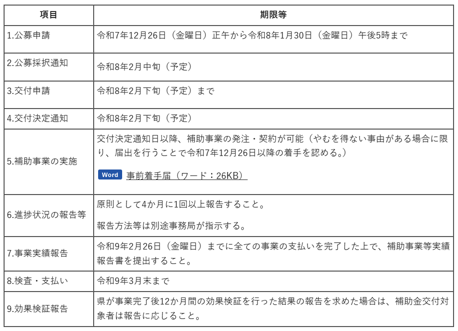 公募申請の締切は令和8年1月30日17時です。採択通知は2月中旬、交付申請と交付決定は2月下旬が予定されています。一方で、事業実績報告は令和9年2月26日までと、かなり長いレンジが取られています。ここに制度の狙いがあります。単発の購入で終わらせず、導入、定着、運用改善まで含めて成果を出してほしい。そのためには、申請の時点で「導入前後で何が変わるか」を描いておく必要があります。導入して終わりではなく、導入してからが本番です。