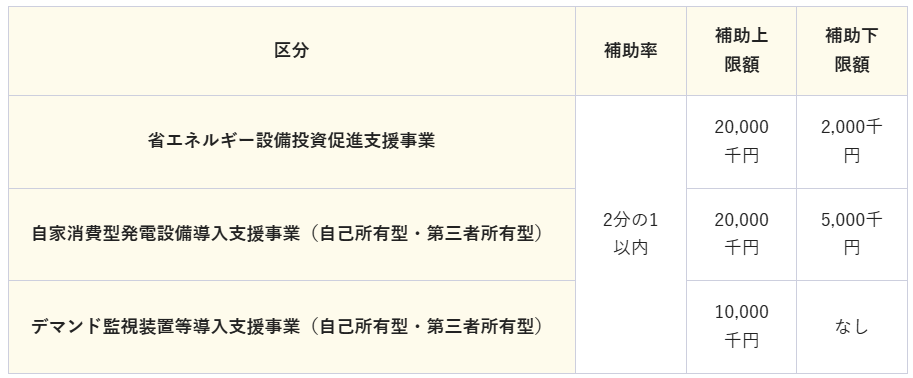 | 省エネルギー設備投資促進支援事業 | 2分の1以内 | 20,000千円 | 2,000千円 |