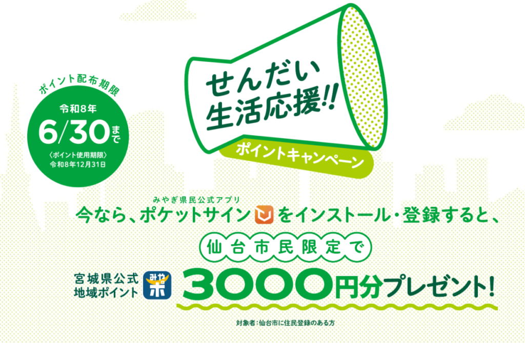 仙台市で「せんだい生活応援!! ポイントキャンペーン」が始まっています。これは、みやぎ県民公式アプリの「ポケットサイン」をスマホに入れて登録すると、仙台市民限定で3,000円分の「みやぎポイント」がもらえるという内容です。1ポイント=1円なので、実質3,000円分の買い物に使えるイメージです。ポイントを受け取れる期間は、令和8年1月21日(水)9:00から令和8年6月30日(火)23:59までです。ただし、もらったポイントを使える期限は令和8年12月31日(木)23:59までなので、「もらったけど使い忘れて失効…」にならないようにだけ注意したいところです。