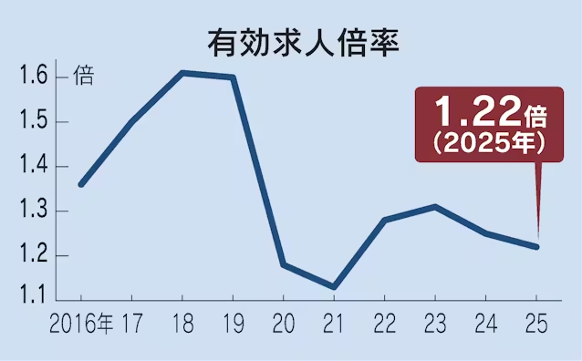 2025年の平均有効求人倍率は1.22倍となり、前年から0.03ポイント低下しました。2年連続のマイナスです。厚生労働省は、物価や人件費の高騰により、企業が求人を出す余力を失っていることが背景にあると説明しています。特に卸売業・小売業、宿泊業・飲食サービス業で求人が落ち込んでおり、セルフレジ導入など省人化の進展も影響しているとされています。一見すると、人手不足が緩和しているようにも見える数字ですが、実務の現場感覚とは必ずしも一致していません。