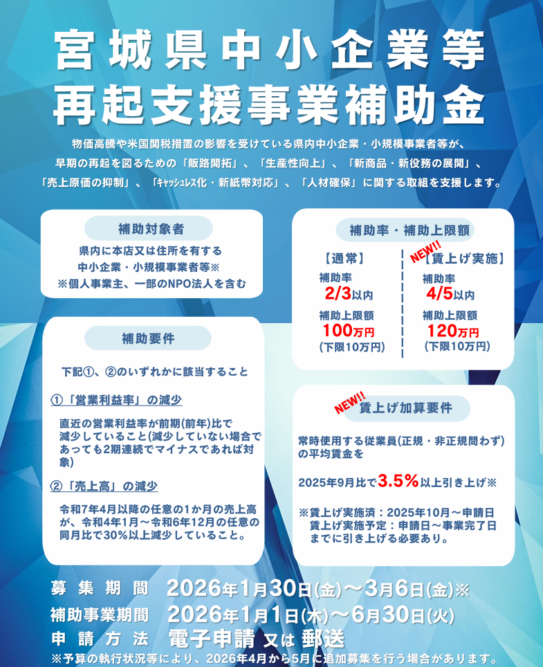 令和7年度12月補正宮城県中小企業等再起支援事業補助金の募集について(PDF:764KB)