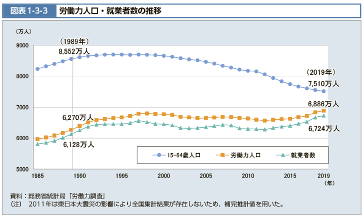 日本では、この30年ほど1人当たりの年収がほとんど伸びていません。直近では名目賃金が上昇しているものの、物価上昇を差し引いた実質賃金は依然としてマイナスが続いています。つまり、働いても生活が楽になった実感を持てない状態が長く続いているということです。この状況下で労働力人口が増えているという事実は、「働くことが魅力的になった」結果ではありません。生活費や将来不安を埋めるために、これまで労働市場にいなかった人たちが参加せざるを得なくなったと見るのが自然です。共働き世帯の増加も、その多くはキャリア志向というより家計維持のための選択です。子どもの数が減り、相対的に大人の人口割合が増えているという人口構造の変化もありますが、それ以上に、1人分の収入では生活が成り立たない社会構造が、労働参加を押し広げている側面は否定できません。