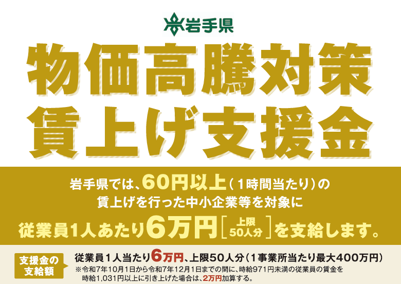 岩手県が令和8年2月3日に制定した「物価高騰対策賃上げ支援金」の募集が開始されました。最低賃金の大幅な上昇が続く中、中小企業が継続的に賃上げを行い、人材確保につなげるための支援制度です。県全体の予算は25億4,000万円で、上限に達し次第終了となります。