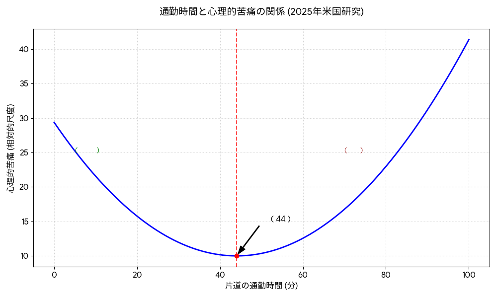 通勤時間は、実は結構軽く扱われがちなテーマです。住む場所は本人が決めたことだから、通勤のつらさも本人の問題だと考えられやすいからです。しかし、メンタルヘルスの観点から見ると、その見方はかなり危ういものです。実際、2025年公表の米国研究では、共働き世帯のフルタイム労働者568人を分析した結果、片道の通勤時間と心理的苦痛との間にU字型の関係が確認され、約44分までは心理的苦痛が下がり、それを超えると逆に上がる傾向が示されました。しかも、この傾向は仕事上の負荷や家庭内負担が高い人ほど強く表れています。つまり通勤は「短ければよくて長ければ悪い」という単純な話ではなく、一定までは気持ちを切り替える時間として機能し、長くなりすぎると負担へ転じるということです。社労士の立場からこの研究を読むと、注目すべきなのは「44分」という数字そのものではないように感じます。大事なのは、通勤時間がメンタルヘルスに影響を与える要素であり、その影響は仕事の重さや家庭責任と組み合わさって強まるという点です。会社がメンタル不調を考えるとき、業務量や人間関係だけを見ていては不十分で、出社のさせ方や通勤負担まで含めて見なければ、実態を取り違えやすいということではないかと考えます。